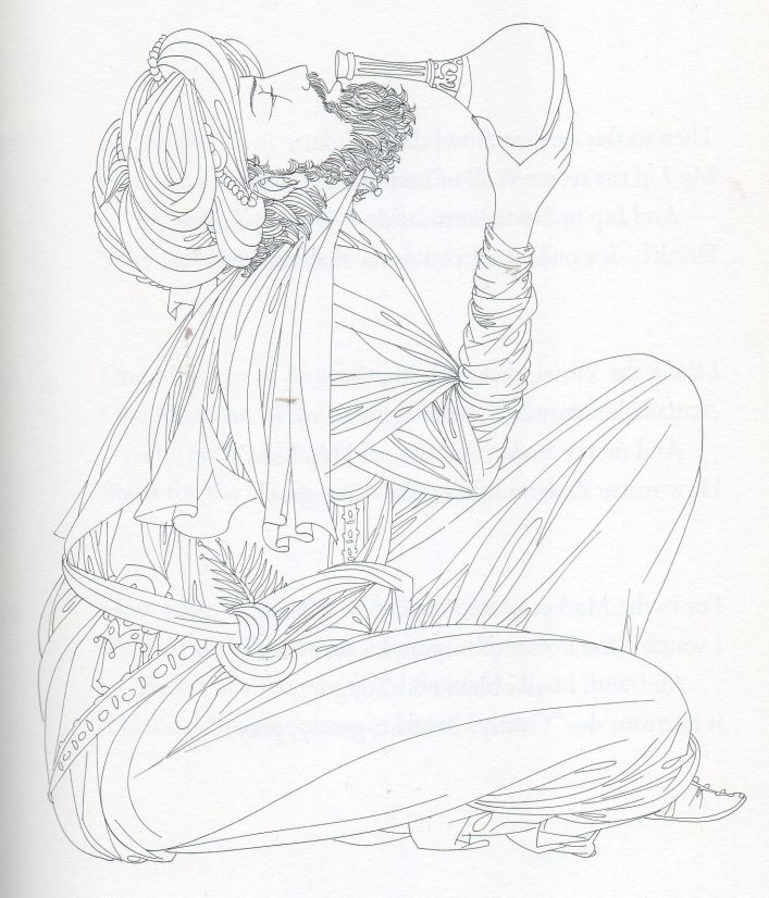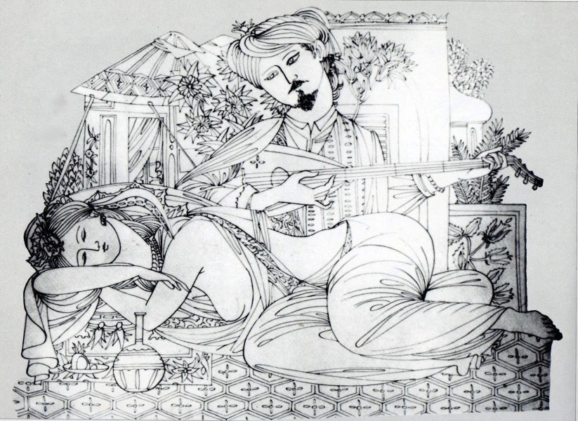 But to return to where we started, Fig.18 is an unsigned, undated, pen and ink poster but known to be by Karlin. But for what ? It is tempting to see Omar serenading his Beloved for once, rather than the other way around, but the style is different enough from his Rubaiyat illustrations to cast doubt on that. Its purpose remains a mystery.