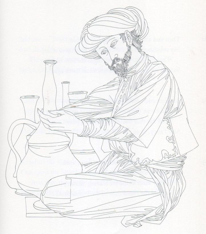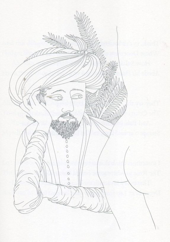 Michel cites The Rubaiyat as one of the books for which his style is perfectly suited, and tells us that, “Karlin chose the scenes which he believed to be representative. These are not real people, they are highly stylised representations, artfully simplified, yet full of rich detail.” I wish I could have asked a few questions about that!