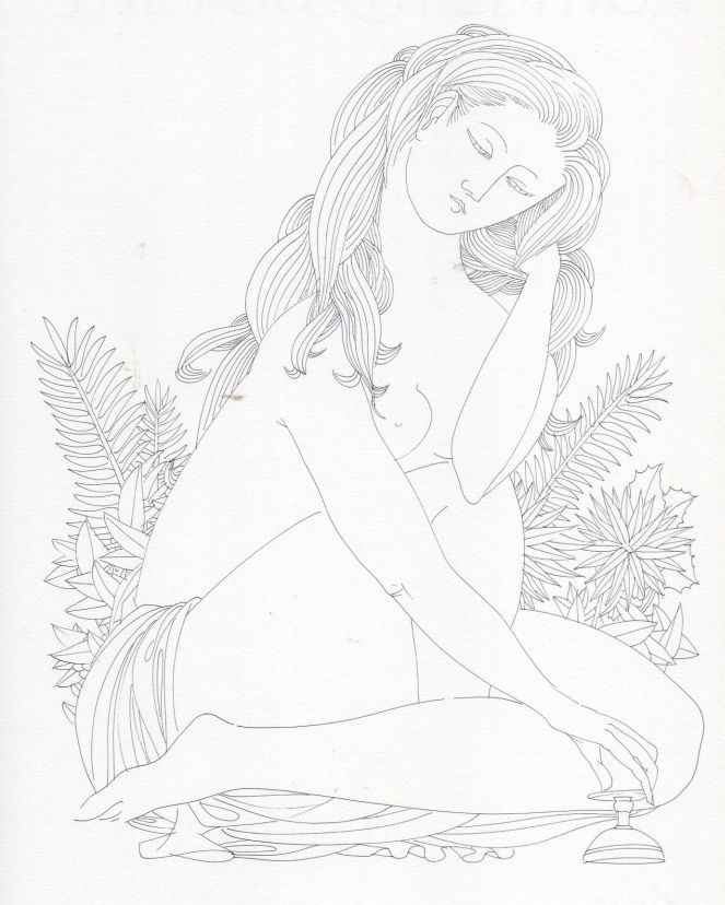 The illustrations appear to be mostly generic, having little if anything to do with any particular verse, on their facing page or otherwise. Thus four of the illustrations feature Omar with his Beloved. Figs.1a (p.41) & 1b (p.45) are two nice examples, and Fig.1c (p.17) shows Omar swigging wine from the bottle, which could relate to numerous verses. The Potter in Fig.1d (p.29) is a general nod towards the Kuza Nama and the Botticelli–like angel in Fig.1e (p.79) presumably relates to the “wingéd Angel” in verse 98 (fourth version), though there is no “unfolded Roll of Fate.” Karlin was one of those artists who involved topless or naked women in his illustrations – in eight of them to be precise -– an amusing example of which is shown in Fig.1f (p.9). I am tempted to see the rear–view nude at which Omar is fondly gazing as “the Worldly Hope men set their Hearts upon” in verse 14 (first version), for which there is actually some evidence, as we shall see later! A similar illustration in which the nude woman appears to be pregnant appears on p.21! As for the topless woman in Fig.1g (p.35), only the turned down empty glass serves to link her with verse 75 (first version) on the facing page.