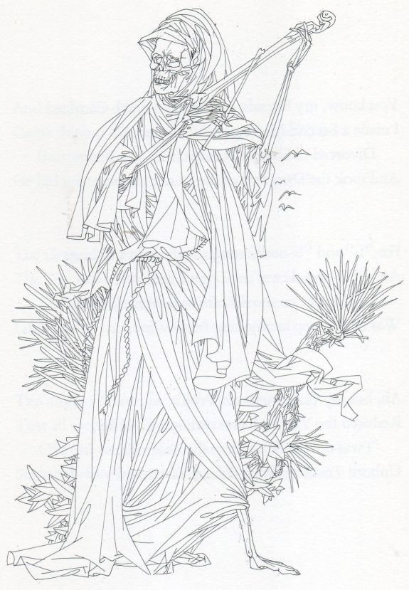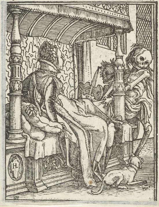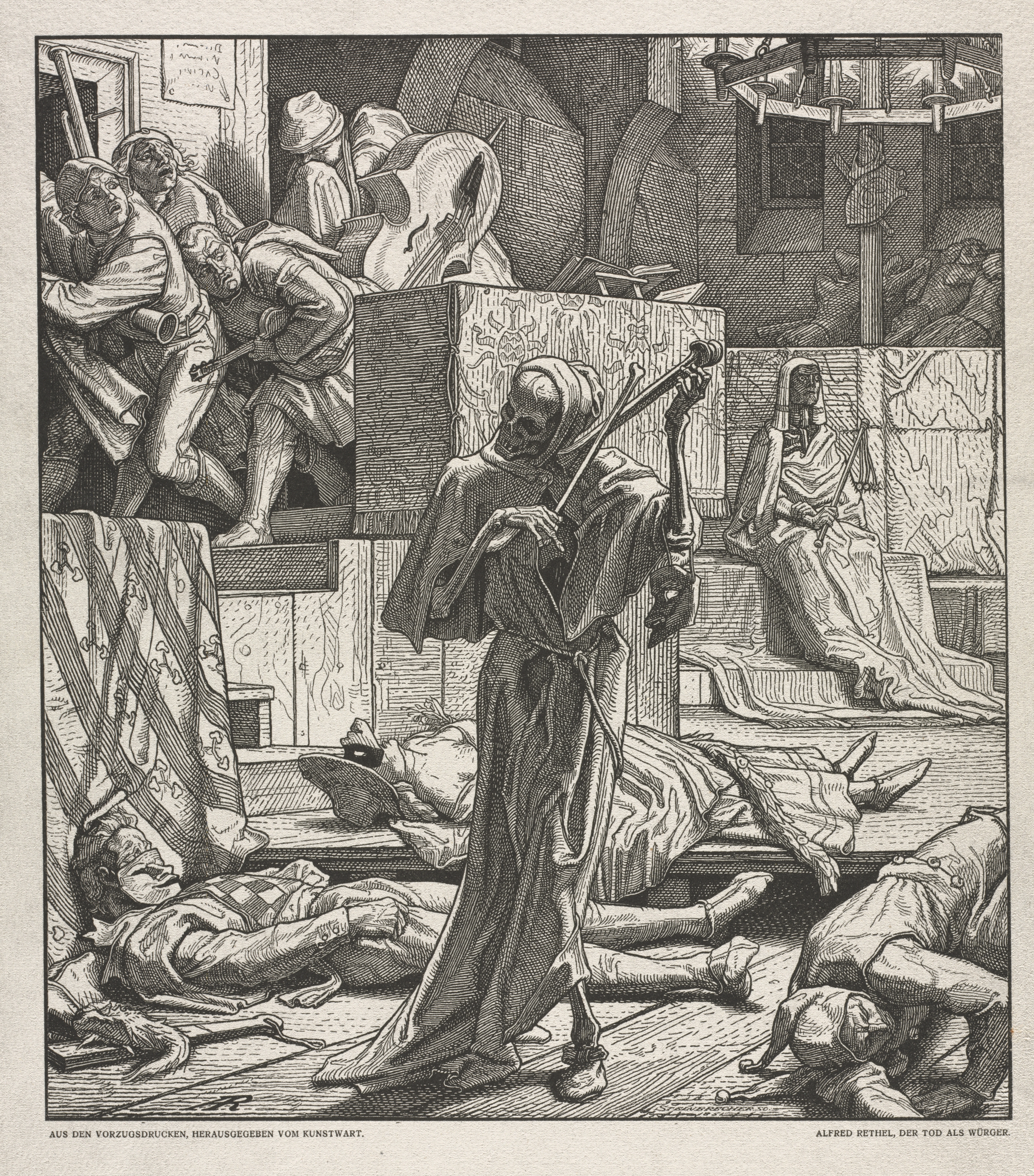 Note 2b: The Rethel print, titled “Der Tod als Erwürger” (Death the Strangler) was published in 1851 but dates back to 1831 and an outbreak of cholera in Paris that year, said to have started at a Masked Ball, hence Death is playing a ‘tune’ using two bones.