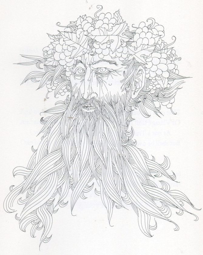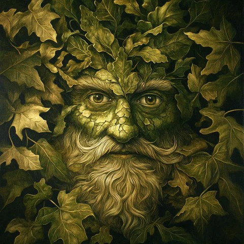 Note 2d: The Green Man is symbol of rebirth and growth, derived from the rebirth and growth of vegetation in the spring. He is often depicted as a head surrounded by foliage, with foliage sprouting from his mouth, and occasionally from his nose & eyes. He is presumably of pagan origin, but common in medieval church carvings, and survives in modern folkloric & neo–pagan festivals (and pub signs!)