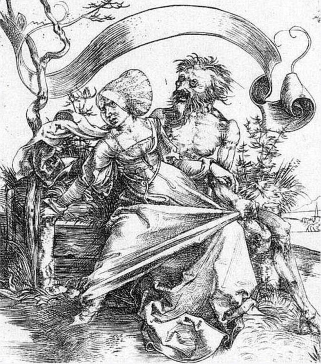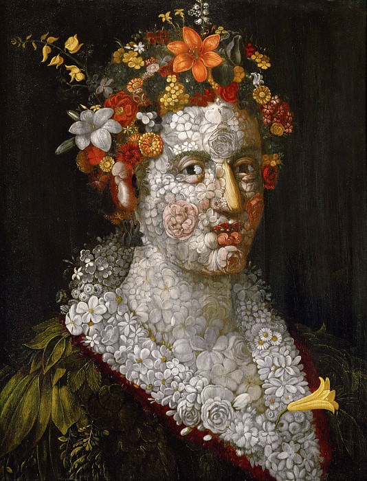 Some of Karlin’s illustrations, though, are strange to say the least. Fig.1h (p.25) seems to be of the Death and the Maiden variety (2a), the Maiden here trying to escape the clutches of Death and (perhaps) halt “the Moving Finger” of verse 51 (first version) on the opposite page. Compare Dürer’s “Young Woman attacked by Death” (or “The Ravisher”) of c.1495 (Fig.2a) and Holbein's “Death and the Duchess” of 1523–5 (Fig.2b). Fig.1i (p.61) is interesting as it is almost a direct copy of the figure of Death shown in a print by Alfred Rethel (2b) dating from 1851 (Fig.2c). Another seemingly irrelevant oddity is to be found in Fig.1j (p.65), which appears to show two dragons fighting, one with wings (Heaven ?) the other not (Earth ?), the battle taking place amid foliage or flames (2c). Quite what that signifies in terms of FitzGerald’s verses is anybody’s guess! Yet another oddity is shown in Fig.1k (p.75), which has the appearance of some images of the Green Man in English folklore (2d), more particularly the modern derivatives (Fig.2d). It also bears rough comparison with some of the heads by the 16th century Italian artist Giuseppe Arcimboldo, like his “Vertumnus” (Fig.2e) and, more particularly, “Flora” (Fig.2f). Make of these what you will.