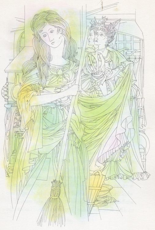 Between 1961 and 1982 Karlin illustrated at least 16 books with his characteristic elegant fine–line drawings, the style of which varied little over this period. Thus Fig.3 is an example from The American Girl Book of First Date Stories (Random House, New York, 1961), illustrating the story “A Gift from Roger” (p.108), and Fig.4 is an example from Marianne Moore’s re–telling of Perrault’s fairy tales, Puss in Boots, the Sleeping Beauty and Cinderella (Macmillan Co., New York, 1963), this showing Cinderella and her two wicked step–sisters (p.37), of course. Note the use of colour wash in this one. Karlin’s illustrations for this book earned him an Award for Excellence in the Society of Illustrators exhibition of 1963.