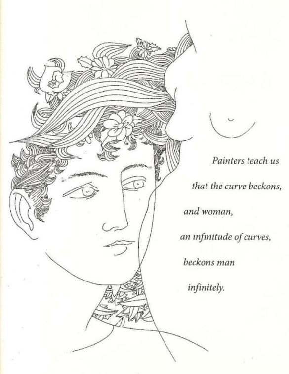 Between 1977 and 1982 Karlin illustrated four titles for the Franklin Library of Pennsylvania, the most interesting of which is the first, Baudelaire’s Flowers of Evil , a work which gives an artist plenty of scope for the imagination (and much room for nudes!) Fig.7a is the frontispiece of the book; Fig.7b (p.29) illustrates the poem “Giantess” (in which the poet fantasises that he has a giantess as a lover); Fig.7c (p.39) illustrates the poem “Her Hair”; Fig.7d (p.153) illustrates “The Little Old Women”; Fig.7e (p.165) illustrates “The Dance of Death”, with its companion piece, Fig.7f (p.228), the generic frontispiece to the section “Death.”