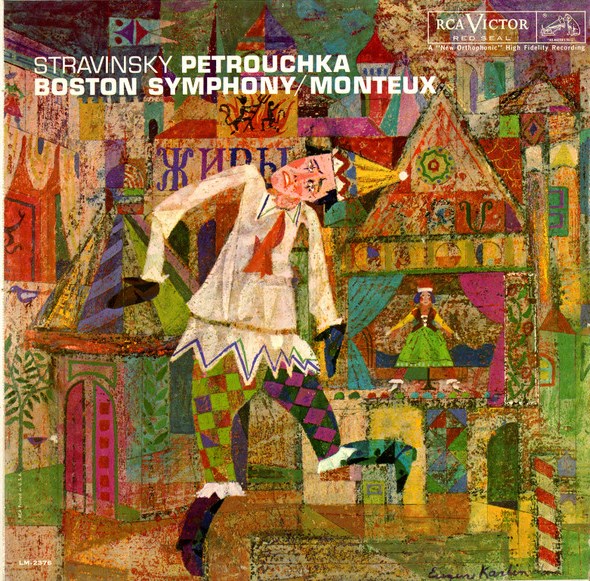From as early as the 1940s many commercial artists were in demand for the design of album covers, and Eugene Karlin was one such, working in this field between about 1955 and 1977 (3). Eight examples are given here, in chronological order: Fig.9a, Prokofieff’s “Romeo and Juliet”, dating from 1957; Fig.9b, Purcell’s “Dido and Aeneas”, dating from 1959; Fig.9c, Stravinsky’s “Petruschka”, dating from 1960; Fig.9d, “Hassidic Z’Miros”, dating from 1962; Fig.9e, Prokofieff’s “Symphony–Concerto for Cello and Orchestra”, dating from 1964; Fig.9f, Debussy’s “Chansons de Bilitis”, also dating from 1964; Fig.9g, Stravinsky’s “Orpheus” and “Apollo”, dating from 1965; and Fig.9h, “Stan Getz plays Bacharach and David”, dating from 1968. [Browse here.]