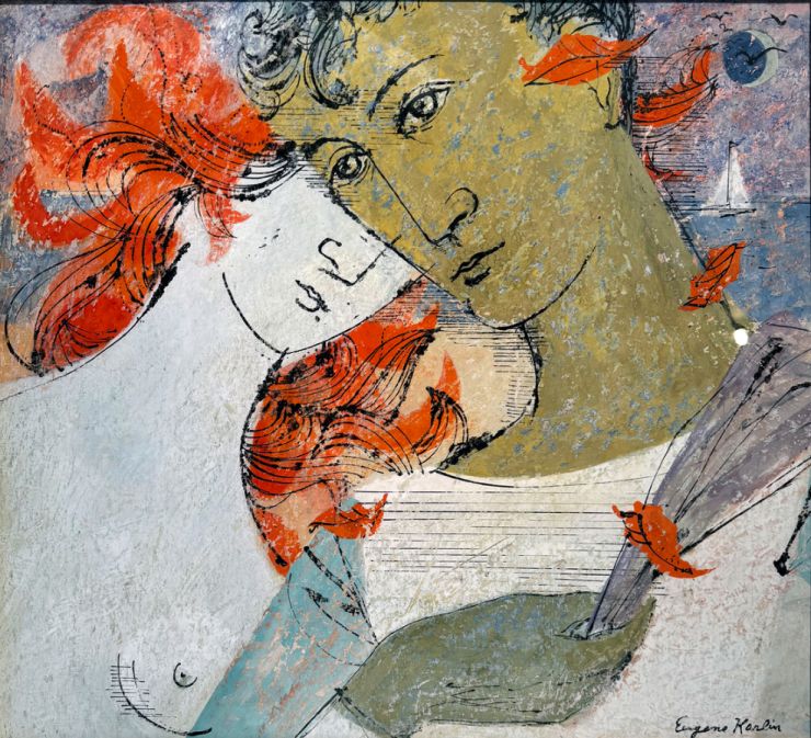 So, from the mid–1940s through to the 1980s he was involved in a mixture of commercial art, album covers, book illustration, teaching, and, of course, painting to which we shall return in the next section. Notably, in 1977 Karlin was invited to deliver a series of lectures to art students in Japan, where there was considerable interest in his work. The result was the “Eugene Karlin Special Issue” of the magazine Vision, as referenced more fully in note 4. The photograph of Karlin and his wife Evelyn, shown in Fig.13, was taken on this trip.
