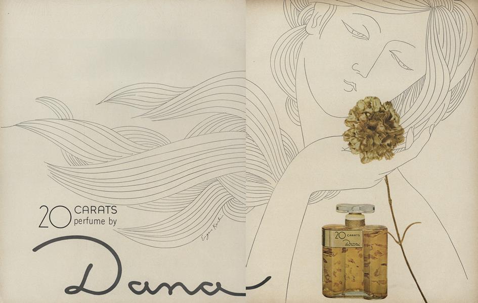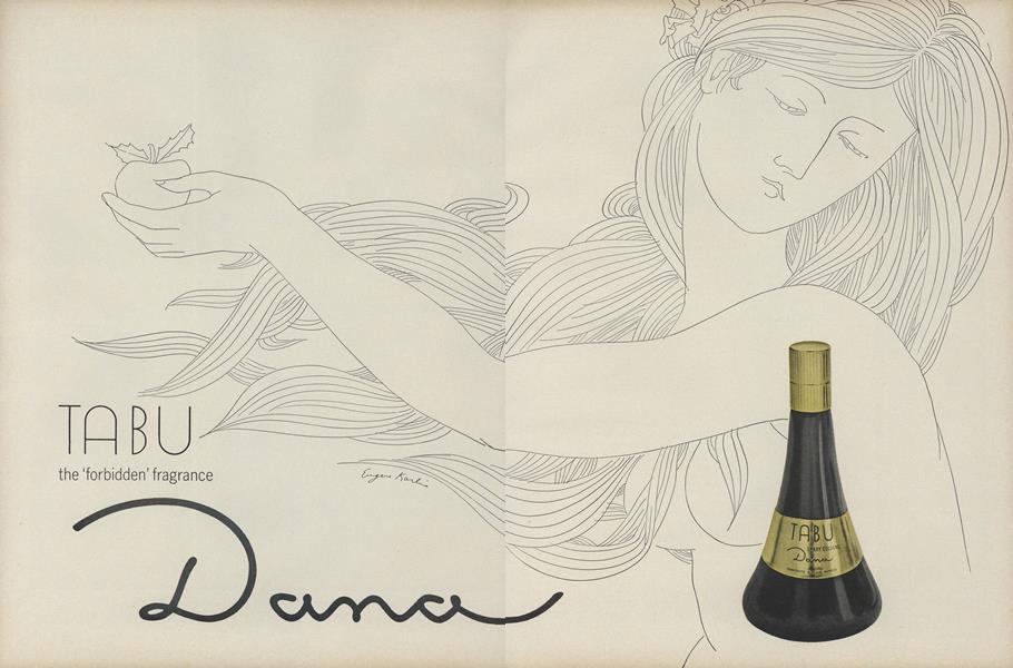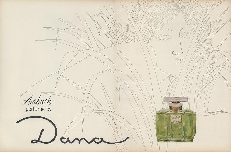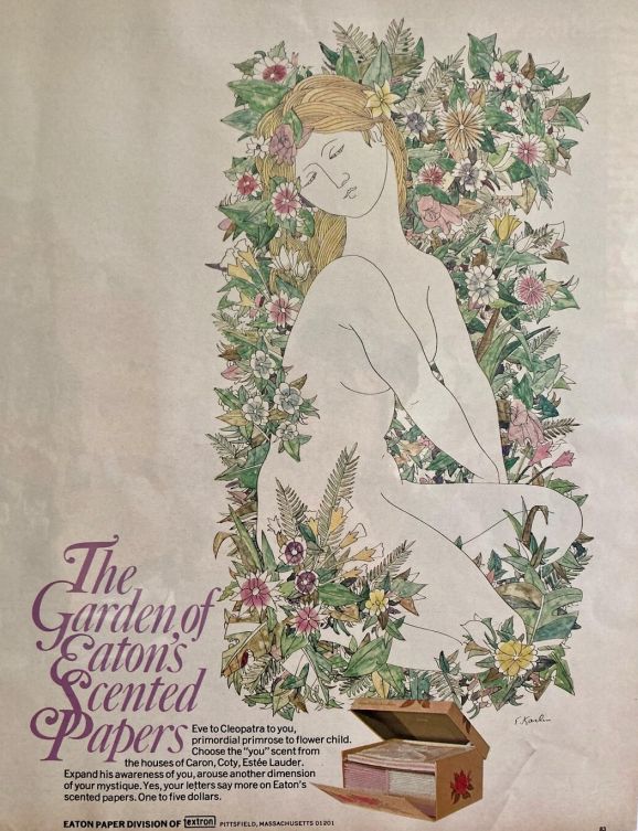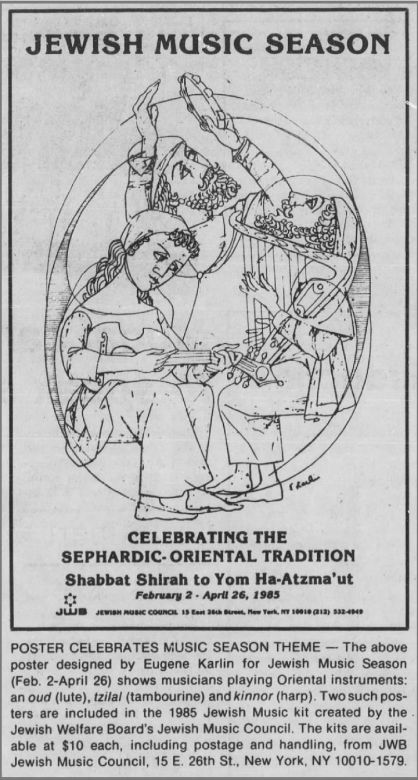 An illustration from an article on Cotton Mills published in Fortune in May 1944 (p.142) is shown in Fig.10a; one from an article on the effects of post–war rationing in Britain published in The New Republic on 24 May 1948 (p.12–3) in Fig.10b; an illustration which he did for a story published in the September 1958 issue of Playboy (p.58) in Fig.10c; and a cover which he did for the 28 September 1958 issue of Today’s Living in Fig.10d. Of particular interest here are three two–page spread adverts he did for three of the Dana Perfume Company’s products in 1966: “20 Carats” (Fig.11a), “Tabu” (Fig.11b) and “Ambush” (Fig.11c), for it is almost as if Omar’s beloved (or Baudelaire’s mistress) had modelled for them! These featured in several leading publications, including Vogue, The New Yorker and Harper’s Bazaar. (In the advert for Tabu, “the forbidden fragrance”, note the nod towards Eve with her Apple in the Garden of Eden.) Parallel to these we have an advert he did for “The Garden of Eaton’s Scented Papers” which appeared in the magazine Seventeen in 1969 (Fig.11d.) Much later than these, he did an interesting poster for the Jewish Music Season in The Wisconsin Jewish Chronicle (8 February 1985, p.3), shown in Fig.12. Is this, plus the Hassidic music design of Fig.9d, a nod towards his Jewish ancestry ? [Browse here.]