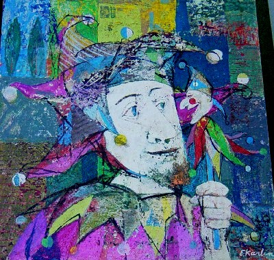 His paintings are more abstract than his drawings, with a geometric feeling. He likes to achieve a depth and richness of color, which is obtained through an unusual procedure. Sometimes Karlin paints over a used canvas, allowing small areas of the former painting to show. He also employs the wax method: wax is applied over tempera and scraped away in certain areas. Ink lines may also be added for accent. The whole procedure results in a rich, dimensional texture. (p.72)