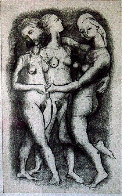 Let us start with three black and white prints, Fig.14a titled “Factory Town” (1940), Fig.14b titled “Workers under Fascism” (1941) and Fig.14c titled “Night Shift” (1941). These are all signed and dated, but Fig.14d (“The Family”), attributed to Karlin and assigned a date of 1941, appears to be neither signed nor dated, though the signature and date have perhaps been lost in cropping. Clearly, though, it is a close relative of “Night Shift”. The perspective of the background scene of Fig.14a reminds me of de Chirico, whilst Fig.14b has a sort of cubist feel to it, and the heads in Figs.14c & 14d are vaguely reminiscent of some of those in the sinister works of Odilon Redon. All have curiously distorted human forms, more of which are to be found in colour – heads in Figs.15a, 15b, 15c & 15d; full bodies and nudes in Figs.16a, 16b, 16c, 16d, and with a return to black and white in Fig.16e – this last, perhaps, being Karlin’s unusual take on the three Graces! All of these are signed, but only Fig.15b has a known date, 1945. The square head of Fig.15a reminds me of that in Fig.14a, though the origins of both remain unclear; Figs.15b, 15c, 16a, 16b & 16c remind me of Picasso, who produced wide variety of distorted heads and bodies; Fig.15d is probably an unused design for a record cover, its intense almost Fauvist colouring being like that of Figs.9a & 9c; and Fig.16d remains a surrealistic oddity! Different again are the “Still Life With Bottle” in Fig.17a and the picture of a dog in Fig.17b, both in cubist style, the latter known to have been painted in Mexico in 1945. All in all, then, we have a wide variety of styles with a wide variety of possible influences in addition to those already mentioned (the Dance of Death, Orozco etc.). I asked Karlin’s daughters about his favourite artists, and not surprisingly Picasso was his favourite, but he was also much influenced by the art of the American Dust Bowl and the Great Depression of the 1930s. The latter presumably throws some light on Figs.14a, 14b, 14c and 14d.