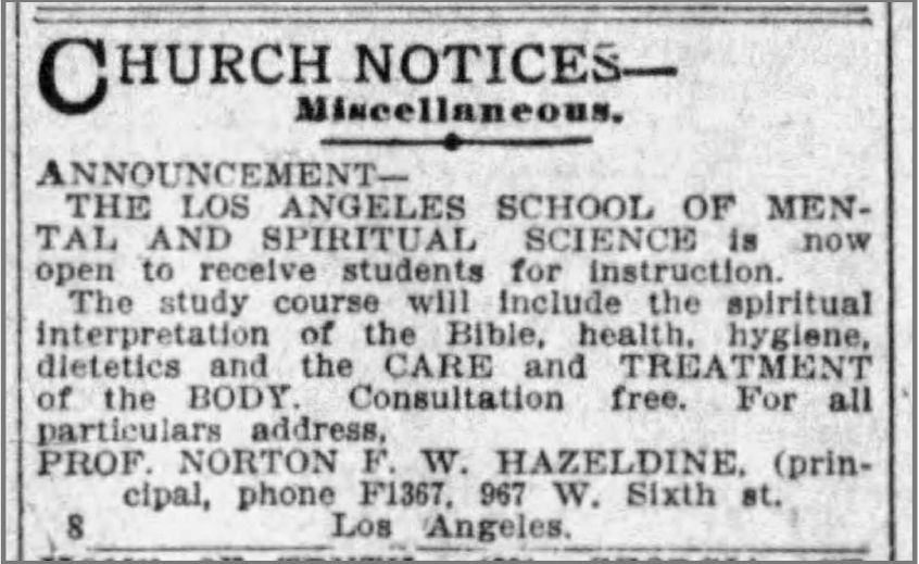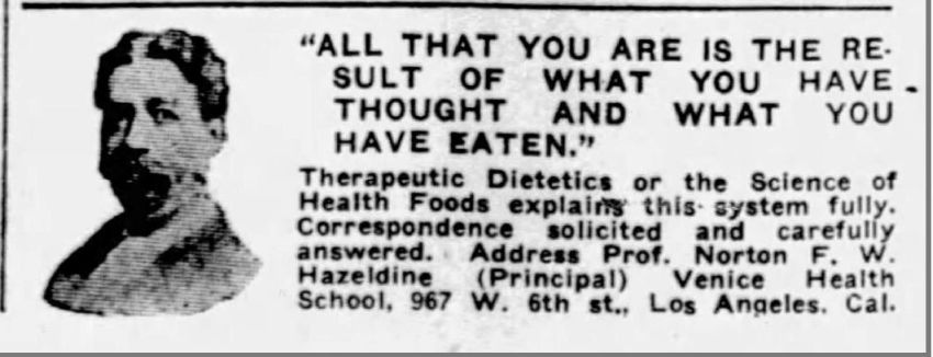 Backtracking to 1902, now, in addition to his first edition of The Sufism of the Rubaiyat he also privately published an edition of The Dhamadpada, or The Path of Righteousness, a collection of the sayings of Buddha. In a newspaper interview in 1905 (4a) he claimed that much of his early life was spent in India with his parents, where he became interested in Buddhism and adopted the religion, but this seems unlikely given his above–mentioned appearances in the UK census records, and the fact that his father died in Keston, Kent in 1878! Be that as it may, at the time of this interview Hazeldine was apparently enthralling society women with the theory that “beauty is an ethical as well as physiological phase of evolution of character” and that a healthy mind in a healthy – and beautiful – body, with the help of proper diet, “simple oleaginous, cereal, nutal and fruital”, was the way thither. It will come as no surprise, then, to learn that another book by Hazeldine, Therapeutic Dietetics – basically tasty vegetarianism for just such a mind and body – had been published in 1904. Its first edition had a modest title–page (Fig.3a) but its second edition (undated but c.1908) was rather more ‘flashy’ (Fig.3b), with Hazeldine now the Principal of the Venice Health School, Venice–on–Sea, California. Fig.3c is an advert for it from The Los Angeles Times on 4 October 1908 (p.125) in which Hazeldine has been promoted to Professor. The same newspaper on 8 November 1908 (p.47) featured an advert for Prof. Hazeldine’s School of Mental and Spiritual Science (Fig.3d), presumably a re–named Venice Health School or a branch of it, as they shared the same address. From the same address, of course, one could buy his books – Fig.3e is from The Los Angeles Times for 11 October 1908 (p.125).