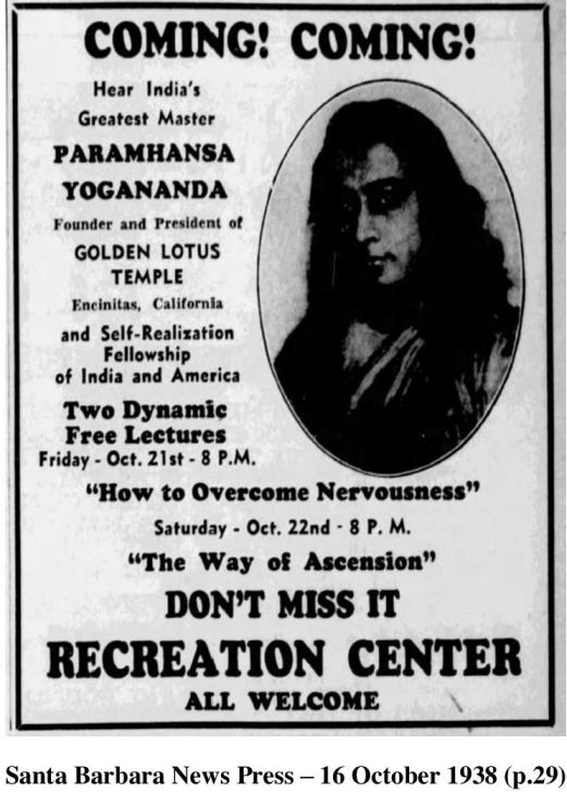 He was born Mukunda Lal Gosh in India on 5 January 1893, the son of a well–to–do Vice–President of a Railroad Company. In 1915 he joined the ancient monastic Swami Order, thus becoming Swami Yogananda, that name being bestowed upon him by his guru in the order. Yogananda means literally “yoga bliss”, signifying one who has achieved union with God through yoga. He went to America in 1920, and in that same year founded the Self–Realisation Fellowship (SRF) in Boston. The following year he established its international HQ in Los Angeles (recall the publisher of his book Wine of the Mystic, mentioned above), the spread of its popularity being surprisingly rapid, this being promoted by extensive lecture tours. Self–Realisation was to be obtained through yoga and meditation, of course, bringing the practitioner closer to God. It also sought to show the basic unity of Eastern and Western beliefs, lectures being delivered on a curious mixture of Christian as well as Hindu topics, as we shall see. The name Paramhansa was bestowed upon Swami Yogananda by another guru in 1935, so that for a while he became Paramhansa Swami Yogananda. The name Paramhansa means literally “the Highest Swan”, the swan being associated with the God Brahma, hence “one who has achieved the highest spiritual realisation.” In 1937 he founded the Golden Lotus Temple, essentially a hermitage and meditation centre, at Encinitas on the Californian coast, but it slid into the sea as a result of coastal erosion in 1942, a disaster which Yogananda is said to have regarded not as Divine Disapproval, but, by analogy with Christ, as its “crucifixion”, urging that it should be followed by its “resurrection” elsewhere – and in multiple sites – all of which duly came to pass, one of them in Hollywood! Between about 1938 and 1948 his numerous lectures can be traced through newspaper adverts, of which more below. He died of a heart attack on 7 March 1952 whilst delivering a speech at a dinner. Some of his disciples, however, believe that his death was a case of mahasamadhi, a master yogi’s conscious decision to leave this life and achieve final unity with the cosmos, free from reincarnation back on earth. It is also said that after his death his body showed little or no sign of physical deterioration – the state of incorruptibility associated with various Christian saints, of course, though some, like St. Bernadette of Lourdes, have admittedly been given a helping hand with a layer of flesh–coloured wax.
