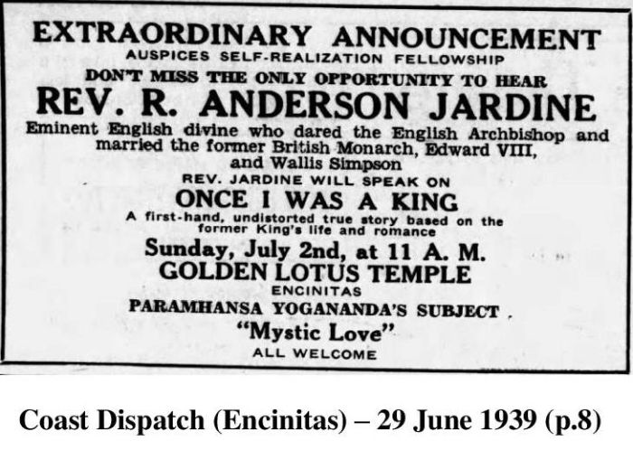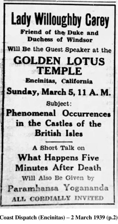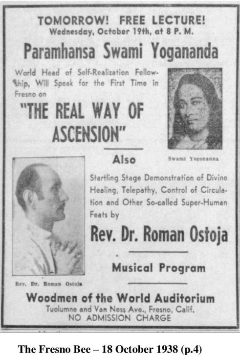 As already indicated, newspaper advertisements tell us a lot about the organisation. Fig.8a is the earliest I have come across, dating from June 1938 – note the Swami in his name. Fig.8b, from October 1938, uses a typical “Roll up! Roll up!” advertising technique, and Fig.8c, also dating from October 1938, shows Yogananda (with Swami again) with a ‘supporting act’ – Rev. Dr. Roman Ostoja and his Super–Human Feats. Fig.8d, dating from December 1938, is in what was to become a regular format, in the Encinitas newspaper Coast Dispatch, for lectures at the Golden Lotus Temple there. This lecture was of the West meets East type. Subsequent lectures bore titles “Who made God ?” (March 1939), “The Mysteries of Prenatal Existence” (April 1939), “God Versus Satan” (May 1939), “Healing Colds by Magnetic Fasting” (June 1939), “How To Make Youth More Lasting” and “How to Develop Personal Magnetism” (both July 1939), “How to Make Yourself Liked by All” (August 1939), “The Art of Becoming Beautiful in Body, Mind and Soul” (October 1939), “How to Govern Your Stars Instead of Being Governed by Them” (July 1940), “How to Measure Your Wisdom” and “Do the Dead Return ?” (both July 1941.) As for using celebrity names to boost publicity, Fig.8e (March 1939) and Fig.8f (June 1939) are two good examples.